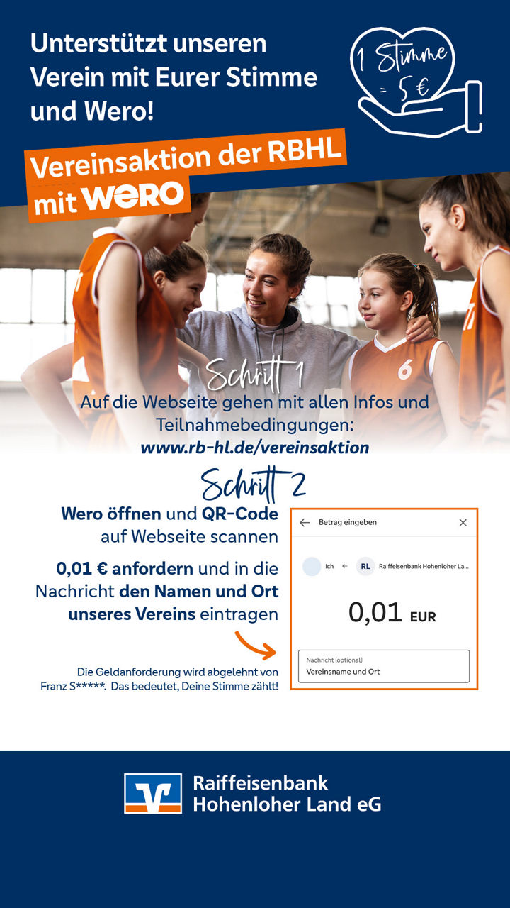 Schalten Sie in Ihrer VR Banking App Wero frei und fordern Sie anschließend per Wero 0,01 € über unsere Mailadresse wero@rb-hl.de (Franz S*****) an. In der Nachricht bzw. im Betreff tragen Sie den Namen und den Ort des Vereins ein, den Sie mit einer Spende unterstützen möchten. Mehr ist für unsere Wero-Vereinsaktion nicht zu tun.